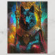 At the center of the flyer are two magnificent artworks, one showcasing a majestic black wolf king and the other depicting a noble German Shepherd dog. Both illustrations capture the regal and powerful presence of these breeds, highlighting their strength, intelligence, and beauty.