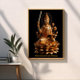 A majestic golden Buddha stands peacefully, cradling a white lotus flower in one hand. Radiating a warm light, the figure is set against a glowing halo, symbolizing enlightenment and spiritual serenity in a tranquil atmosphere.