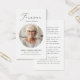 Keep the memory of your loved one close with our In Loving Memory Funeral Memorial Prayer Card. These simple and modern prayer cards serve as a beautiful tribute to honor their life and offer comfort during this difficult time. Featuring an elegant design, customizable with a photo of your choice, these prayer cards are a heartfelt way to remember and cherish their memory. Whether you're holding a funeral service, remembrance gathering, or simply want to provide a keepsake for family and friends, these memorial cards are a meaningful choice. The words "In Loving Memory" and "Forever in Our Hearts" express the enduring love and impact they had on your life. Additionally, these prayer cards offer bereavement support, with heartfelt prayers and tributes that provide solace and strength. Suitable for Christian, Catholic, and other religious services, they offer a holy and respectful touch. Create a personal and comforting tribute with our In Loving Memory Funeral Memorial Prayer Card.