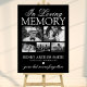 Funeral memorial foam board poster featuring a black background that can be changed to color, 5 photographs of your lost loved one, the text "in loving memory", their name, birth/death dates, a sweet heart, and the remembrance saying "gone but never forgotten".