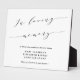 This In Loving Memory wedding sign tabletop plaque is a touching tribute to honor loved ones who are forever in your heart on your special day. Designed with a soft and elegant style, it adds meaningful sentiment to your wedding décor. The gentle message creates a moment of reflection while blending beautifully with a variety of wedding themes. Perfect for remembrance tables or quiet corners, it offers a respectful and heartfelt presence. Its tabletop size allows for easy placement without overwhelming the setting. This plaque serves as a beautiful keepsake celebrating love, memory, and enduring connection.