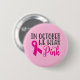 In October We Wear Pink button to raise awareness and support those who have fought and those who are still fighting Breast Cancer. The design features a pink ribbon along with simple typography. Design can be customized to add text, date or logo to make your own personalized button. © TheDesignHippo