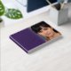 A funeral memorial tribute book. A simple in our hearts forever typographic heart script logo design in silver foil on purple add your own photo, name and dates. Original design by www.mylittleeden.com