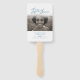 White and blue funeral program order of service double-sided simple in our hearts forever ceremony program fans. Simple yet elegant style program fan ideal for a summer memorial service to keep your guests cool informed and give them a keepsake of person whom they are remembering. Simply replace sample text and photo holder with your own special photo and funeral service information details. Original typography and in our hearts forever graphic design by Sarah Trett. www.sarahtrett.com for www.mylittleeden.com (Photo credit by Guilherme Stecanella on Unsplash model photo is just a placeholder image for you to replace).