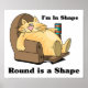 A cartoon of a fat cat lounging in his favorite chair with the words I'm in Shape, Round is a Shape surrounding it. Hey, we can't all have bodies of a God. Let the world laugh with you
