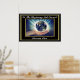 This christian vintage Genesis one In the beginning God created. With a black and gold frame poster. Has a Colorful vibrant Christian space design. With beautiful planet held in a hand. Looking like space clouds.The Bible verse Genesis.1 In the Beginning God Created.
