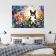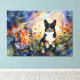 This image features a black-headed tri-colored corgi amidst a vibrant field of flowers. The artwork is rendered in a fluid alcohol ink style, creating a unique visual effect.