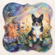 This image features a black-headed tri-colored corgi amidst a vibrant field of flowers. The artwork is rendered in a fluid alcohol ink style, creating a unique visual effect.