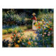 "In the Garden" is a vibrant depiction of outdoor life. The scene portrays a lush garden filled with blooming flowers, where a single figure is leisurely enjoying the serene environment. The central figure, often believed to be Monet's wife, Camille, is carrying a flower basket surrounded by a profusion of colorful flowers. The painting is characterized by its rich use of color, dappled light, and the delicate interplay of shadow and sunlight, which creates a sense of warmth and tranquility. The loose brushwork and attention to the effects of light on natural elements reflect an Impressionist style, emphasizing the beauty of everyday moments spent in nature. This work captures the essence of a peaceful, sunlit afternoon in a garden, where the vibrancy of the flowers and the gentle atmosphere combine to create a timeless scene of relaxation and contentment.
