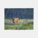 A photograph of a Black-tailed Deer in a meadow of purple Lupines and other wildflowers. A rising mountain in the background is covered in pine trees.