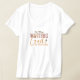 T-Shirt depicts simple gold and brown script on a white background. It features a cross and an inspirational Christian quote, "In the waiting, God is working."