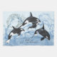 Incredible watercolor orcas art of swimming and jumping orcas and a baby orca with water splashes and waves.