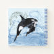 Incredible watercolor orcas art of swimming and jumping orcas and a baby orca with water splashes and waves.