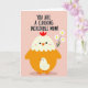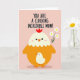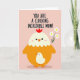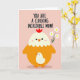 This card features a rounded orange bird with a cream-colored head, a red comb, and tiny black dot eyes, holding a small pale-yellow chick close with a tender, protective posture ❤️. Soft pink blush on both faces adds a gentle, affectionate look, like they’re sharing a quiet moment together. The background is a wide blush-pink field that keeps the focus on the pair and gives the scene a cozy, friendly tone. Near the right side, a small cluster of three white daisies with sunny yellow centers brings in a light, caring touch 🌼. Across the top, the message “YOU ARE A CLUCKING INCREDIBLE MUM!” is set in black, all-capital letters, centered and easy to read. The simple shapes and smooth color areas make the characters feel approachable, with the larger bird’s rounded wing wrapping around the chick. The bouquet sits to the right of the birds, with three white petals rings circling bright yellow centers against the pink background.