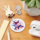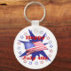 Keychain with my red, white and blue design of the American Flag surrounded by stars. Text says "Happy July 4th".