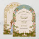 The design features intricate arches, delicate arabesques, and lush floral greenery, evoking the grandeur of Mughal-inspired architecture and the romance of Indian heritage. The ornamental patterns are balanced with a fresh, vibrant color palette, symbolizing the harmony and joy of your upcoming union.