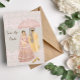 An elegant illustration of a an Indian couple on their wedding, the bride looks very pretty in pink and the groom holding an umbrella with a blush pink lace background, includes personalization .