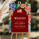 Elegant wedding welcome sign featuring a beautiful arch and colorful artwork.