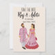 A beautiful and cute pink minimalistic wedding design with an illustrated Indian couple wearing hot pink attire and announcing their wedding date, includes personalization .