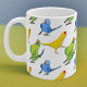 Adorable Indian Ringneck Parakeets dance playfully across your coffee mug in a cheerful pattern that includes the yellow, blue and green color variants. It's the perfect little custom gift for your favorite parrot owner and bird lover!