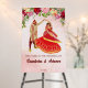 Indian wedding dancing Hindu couple welcome sign board. Indian bride in red lehenga dancing with a groom, wedding welcome sign board with red rose.