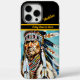 A powerful Native Indian chief stands proud, showcasing intricate feathered accessories and traditional attire. His expression conveys strength and wisdom against a vibrant background.
