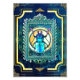 An iridescent aqua and cobalt beetle featured in an ornate frame against a vibrant tribal sun/moon symbol background.