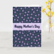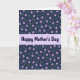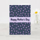 This design shows a deep indigo background covered in many small, five-petaled lavender flowers that feel like a gentle embrace ❤️. Between the blossoms, muted green leaves are sprinkled in small clusters, adding a soft, natural contrast. A wide horizontal band of creamy pale lavender runs across the middle, dividing the floral field like a calm pause. Centered on that band is the text “Happy Mother’s Day” in rounded dark-purple lettering, with the words sized large and easy to read. The repeating flowers and the calm color pairing create a cozy, affectionate mood, like a quiet moment shared between close family members 👩. The overall layout stays simple while still feeling rich with pattern, letting the message stand out without crowding the design. The darker background makes the lighter flowers appear to glow gently, especially around the central band. Tiny lavender blooms continue above and below the stripe, with small green leaf accents scattered evenly across the card.