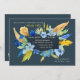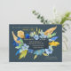 A dramatic floral invitation featuring watercolor wild flowers in golds and blues against a deep blue background.