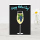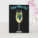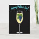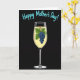 Designed with a sleek, modern look, the card features a tall stemmed glass centered on a deep black background, its edges traced with a thin white glow. Inside the glass sits a pale golden drink that feels like it’s catching candlelight, setting a cozy, romantic mood ❤️. Tucked into the golden liquid is a cluster of deep indigo berries with a warm brown stem, arranged close together like a small shared secret between two friends. Broad green leaves fan outward, adding a fresh contrast that softens the sharp lines of the glass. Near the top, a handwritten-style celebratory message appears in bright blue, floating above the glass with plenty of space around it. The text is placed high and centered, and its clear blue color stands out sharply against the dark background 🌼. Subtle highlights on the glass curve down the bowl and stem, while the berries remain the richest, darkest focal point near the middle.