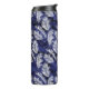 White palm leaves on an indigo blue background, layered with more blue feathery palm fronds.