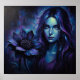 Mystical blue-purple portrait of a luminous woman holding a large dark wildflower, ethereal glow, neon highlights and dreamy fantasy atmosphere.