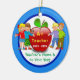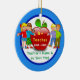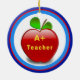 Super Cute inexpensive 2 Sided, Teacher Ornaments Personalized. Type in the YEAR or YEARS, Teacher's NAME and or YOUR TEXT or Delete it all. Great for elementary teacher gifts. Boys and girls showing off "A+ Teacher" gifts. Big apple on the back of the teacher ornament.