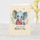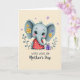 Designed with a sweet digital illustration, the card centers on a baby elephant character with a rounded shape, big shining eyes, tiny lashes, and rosy cheeks that feel like a friendly, affectionate gaze ❤️. It wears a red outfit covered in small white circles, adding a cozy, childlike look. Large ears frame its face, decorated with small yellow flowers and a few soft purple blossoms, as if someone tucked them there with care. The background is a pale cream tone with scattered floral shapes drifting around, giving the scene a light, airy setting. On both sides, slim plant stems with round blue-gray leaves rise gently, like they’re leaning in to keep the character company. To the right sits a small purple present with a matching ribbon, suggesting a thoughtful gesture shared between loved ones 🌼. A short line of message text is placed along the bottom in dark lettering, and the gift’s ribbon forms a neat bow with crisp loops and trailing ends.