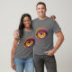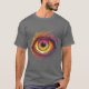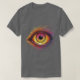 This striking t-shirt design showcases an intense, fiery eye that captivates with its detailed realism and vibrant colors. The eye's iris is ablaze with shades of fiery orange, yellow, and deep red, creating a mesmerizing, molten effect. The pupil is a stark black, providing a dramatic contrast to the vivid hues surrounding it. The eye's lashes and surrounding area are depicted with intricate line work that transitions from bright yellow and orange at the center to deep purples and pinks at the outer edges, adding to the sense of heat and intensity.