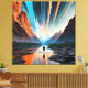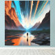 A lone traveler walks among towering mountains mirrored in calm waters, while the sky bursts with cosmic beams of light. The scene blends nature and universe, inviting reflection on the inner journey and the vastness of human dreams.