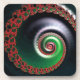 This work features a complex, swirling fractal pattern with a spiral structure that appears to extend infinitely inward. The primary colors are vivid red and lush green, contrasting against a deep, dark background. Along the spiral's path, intricate, smaller fractal shapes repeat, creating a sense of depth and movement. The red fractal elements resemble organic shapes, almost like blooming flowers or curled leaves. The green tones gradually transition to silvery whites closer to the center, adding a glowing effect. Overall, the image evokes a feeling of infinite complexity and dynamic energy.