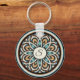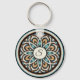 This design radiates movement and harmony through its interwoven pattern. At the center, a flower-like mandala blooms in soft beige, rich brown, and deep black tones accented by vivid turquoise.