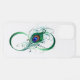 The symbol of infinity with a bright, green, artistic peacock feather on a white background. Tattoo style.