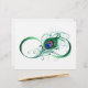 The symbol of infinity with a bright, green, artistic peacock feather on a white background. Tattoo style.