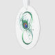 The symbol of infinity with a bright, green, artistic peacock feather on a white background. Tattoo style.