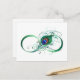 The symbol of infinity with a bright, green, artistic peacock feather on a white background. Tattoo style.
