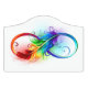 Artistically drawn infinity symbol with beautiful rainbow feather on white background. Tattoo style.