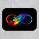 Artistically drawn infinity symbol with beautiful rainbow feather on white background. Tattoo style.