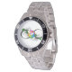 Has heft and feel of expensive stainless steel quartz watches. Good band with safety catch. I removed links, which is easy because engraved arrows show direction to push the linking pins. As always by this seller, the image (a railroad logo) is a perfect reproduction of my emailed image, and is precisely spaced and aligned.