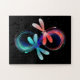 Infinity painted in neon, red and green paint, decorated with two luminous, contrasting dragonflies with glowing, transparent wings on black background. Glowing dragonfly.