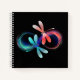 Infinity painted in neon, red and green paint, decorated with two luminous, contrasting dragonflies with glowing, transparent wings on black background. Glowing dragonfly.