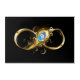 Gold, shiny symbol of infinity, decorated with jewelry peacock feather with turquoise on black background.