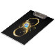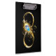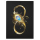 Gold, shiny symbol of infinity, decorated with jewelry peacock feather with turquoise on black background.