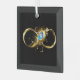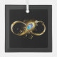 Gold, shiny symbol of infinity, decorated with jewelry peacock feather with turquoise on black background.